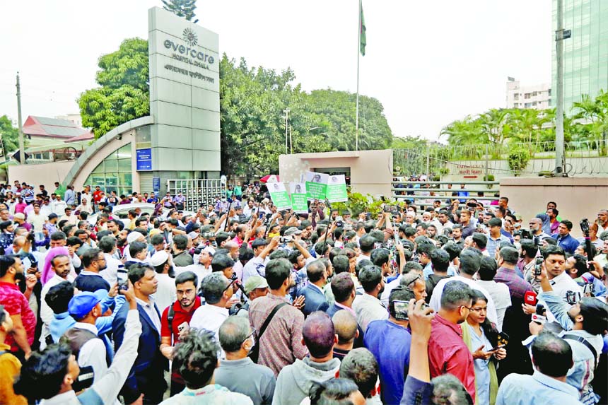 As news spreads that BNP Chairperson Khaleda Zia’s condition has become critical crowds of people from all walks of life including journalists gather in front of Evercare Hospital in the capital on Saturday.