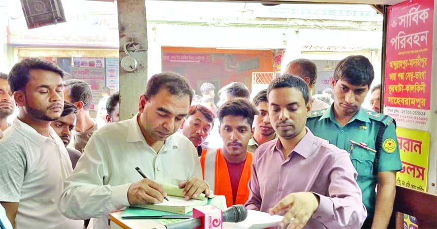 Assistant Director of Directorate of National Consumer Rights Protection Abdul Jabbar Mondol conducts a drive at a counter in Abdullahpur area of the capital on Friday so that the passengers do not have to purchase tickets at an exorbitant price being victim of deception during Eid journey.