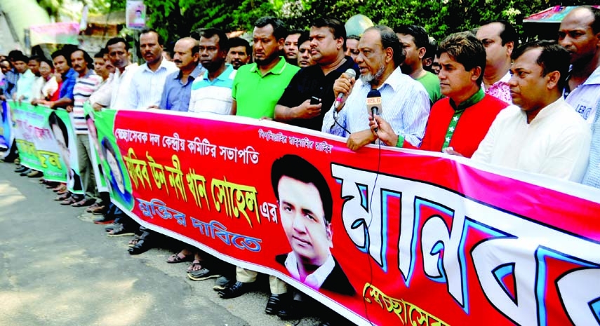BNP Standing Committee member Barrister Rafiqul Islam Miah speaking at the human chain formed by Swechchhasebok Dal in front of the National Press Club on Saturday demanding release of its President Habibunnabi Khan Sohel. President of Daudkandi Upazila Swechchhasebok Dal Mosharraf Hossain was present, among others.
