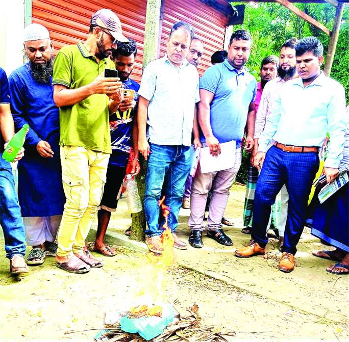 BORHANUDDIN, BHOLA: Assistant Commissioner (Land) and Executive Magistrate Ranjit Chandra Das conduct a crime prevention drive and also burns ganja (cannabis) in Phulkachiya village of the upazila on Monday.