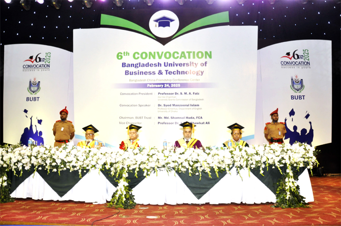 Dr S M A Faiz, Chairman of the University Grants Commission, Prof Dr. A B M Shawkat Ali, Vice Chancellor of BUBT, among others, attend the 6th convocation ceremony of Bangladesh University of Business and Technology held at the BCFCC, Agargaon, Sher-e-Bangla Nagar, in the capital on Monday.