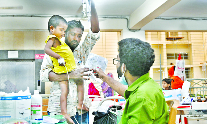 Father of a child with canola and saline at hand takes medicine at Mogda Hospital in the capital as a severe number of dengue paediatric patients have been undertaking treatment there for the last four days. The photo was taken on Monday.