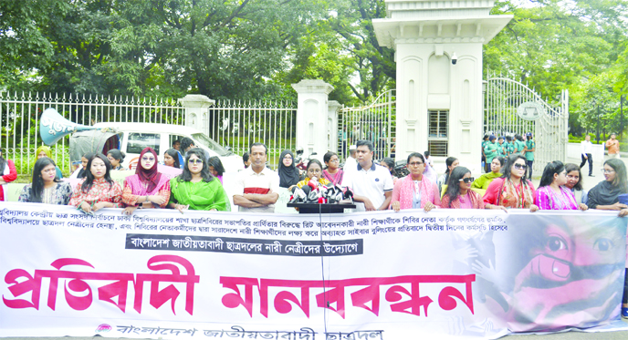 Leaders and activists of Jatiyatabadi Chhatra Dal hold a human chain program on Wednesday in front of the main gate of the Supreme Court protesting against the threat to a female student by a Chhatra Shibir leader centering DUCSU polls.