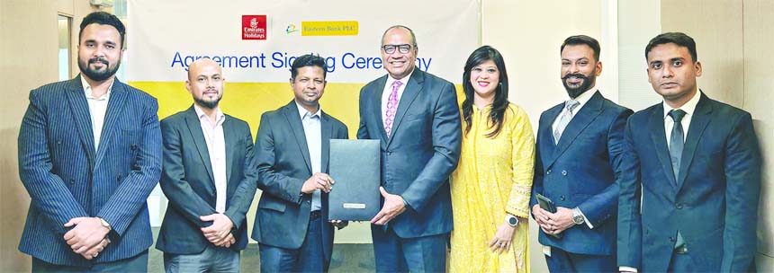 M Khorshed Anowar, Head of Retail and SME Banking of Eastern Bank exchanges a deal document with Md. Yousuf Shohel, Preferred Agent of Emirates Holidays in Bangladesh on behalf of their organisations at a ceremony held in the capital recently. Under this deal, Emirates Holidays to offer special benefits on their products and services to Eastern Bank cardholders.