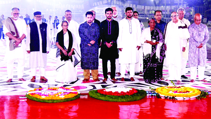 Members of the advisory council pays homage to the language martyrs by placing floral wreaths at the central Shaeed Minar on Friday marking the Shaheed Day and International Mother Language Day.