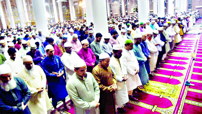 Muslim devotees offer Tarabi prayers at Gausul Azam Jame Mosque in the city's Banani area on Saturday night marking the Holy Ramadan as fasting commences from today (Sunday).