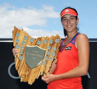 Spanish qualifier Garbine Muguruza won her first WTA title with a 6-4, 6- 0 victory over Czech seventh seed Klara Zakopalova in the final of the Hobart International Saturday.