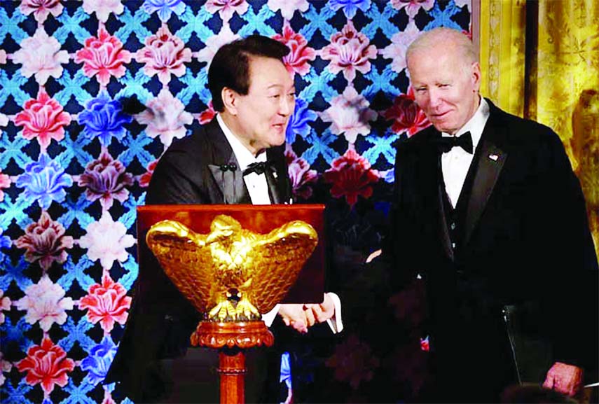 In a toast, Biden recalled the sacrifice by American soldiers to help fight the communist north during the 1950-1953 Korean War and said their countries were bound by “a belief in democracy, liberty, security and above all a mutual belief in freedom.”