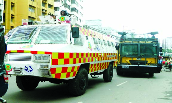 Police patrol on a street in the capital with riot car and water cannon on Thursday, as part of security measures ahead of BNP’s rally to be held today. NN photo New Nation Published: 12:00 AM, 28 July 2023 Updated: 2:02 AM, 28 July 2023