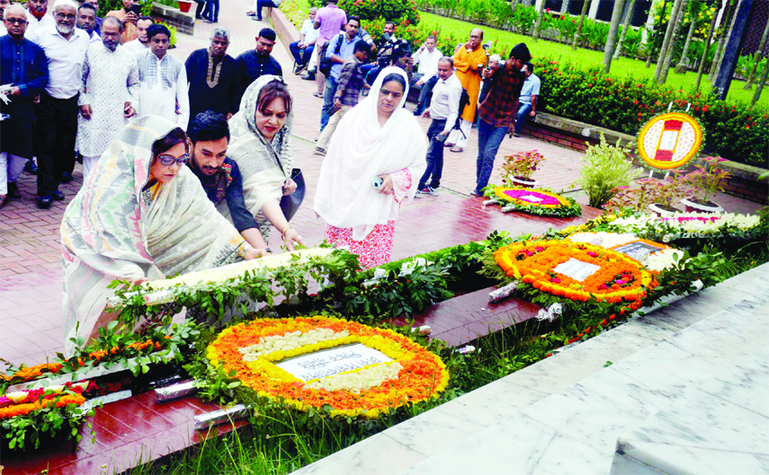 Ruling Awami League (AL) led by its General Secretary and Road Transport and Bridges Minister Obaidul Quader paid tributes to the National Poet by placing wreaths at his grave in the morning.