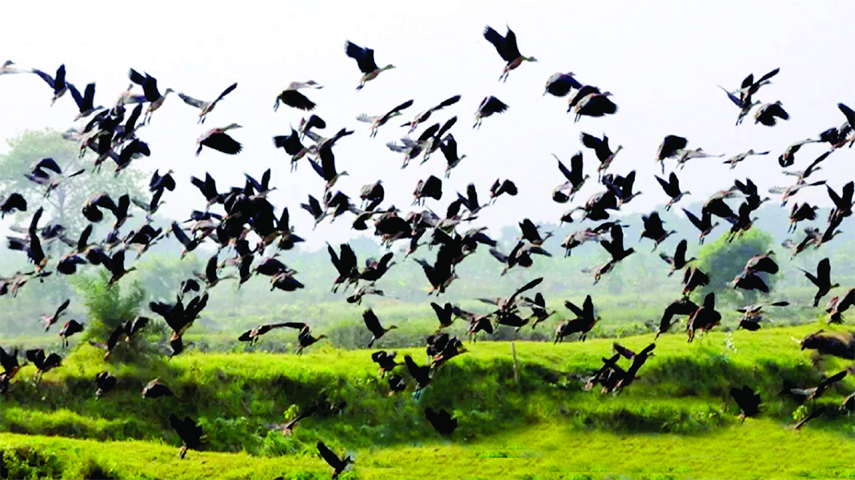 Migratory birds coming to Bangladesh with the advent of winter. This photo was taken from Chanduria area in Rajshahi district on Monday.