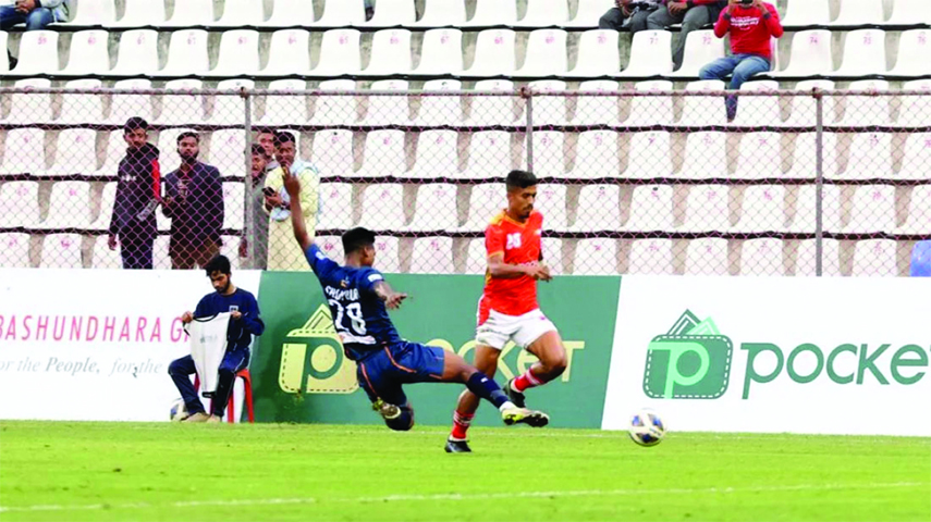 Bashundhara Kings' Rakib Hossain (right) runs with the ball against Brothers Union during a Bangladesh Premier League Football match at Bashundhara Kings Arena in Dhaka on Friday.