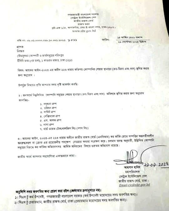 The National Board of Revenue (NBR) has issued a letter seeking suspension of shares transfer (purchase-sale and donation) of 7 companies listed in the stock market.