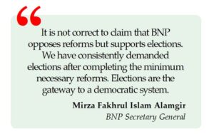 Bangladesh Nationalist Party (BNP) Secretary General Mirza Fakhrul Islam Alamgir reiterated his party’s support for reforms, provided they are followed by elections within a short timeframe. “It is not correct to claim that BNP opposes reforms but supports elections.