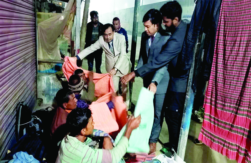 MIRZAPUR, TANGAIL: Upazila Nirbahi Officer ABM Ariful Islam and Assistant Commissioner (Land) Masudur Rahman hand over blankets among the cold-hit people of the upazila on Wednesday night.
