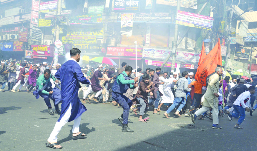Police wield batons and hurl sound grenades to disperse the banned outfit Hizb ut-Tahrir activists while they were trying to bring out a procession at Paltan intersection in the capital on Friday.