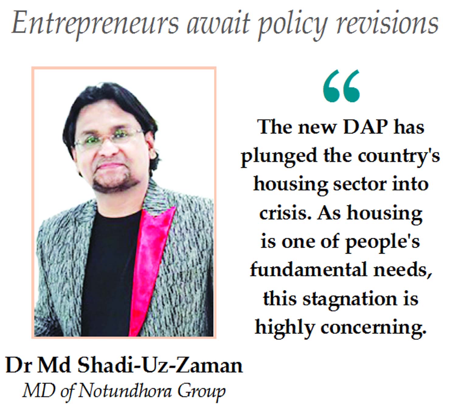 In an exclusive interview with The New Nation, Dr Md. Shadi-Uz-Zaman, Managing Director of Notundhora Group, addressed the challenges facing the housing sector.