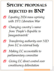 The BNP has also expressed opposition to proposals regarding the renaming of the state, transferring authority over national identity cards (NID), and placing parliamentary constituency delimitation under the control of the Election Commission (EC).