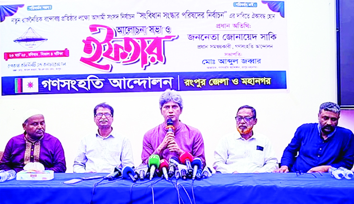 Rangpur: Chief Coordinator of Ganosamhati Andolan Zonayed Saki speaks at a programme at Rangpur on Sunday. New Nation Published: 12:01 AM, 25 March 2025 Rangpur: Chief Coordinator of Ganosamhati Andolan Zonayed Saki speaks at a programme at Rangpur on Sunday.