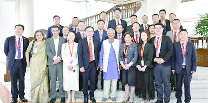 Chief Adviser Dr. Muhammad Yunus poses with a delegation of Chinese investors after a meeting at the State Guest House Jamuna on Tuesday.