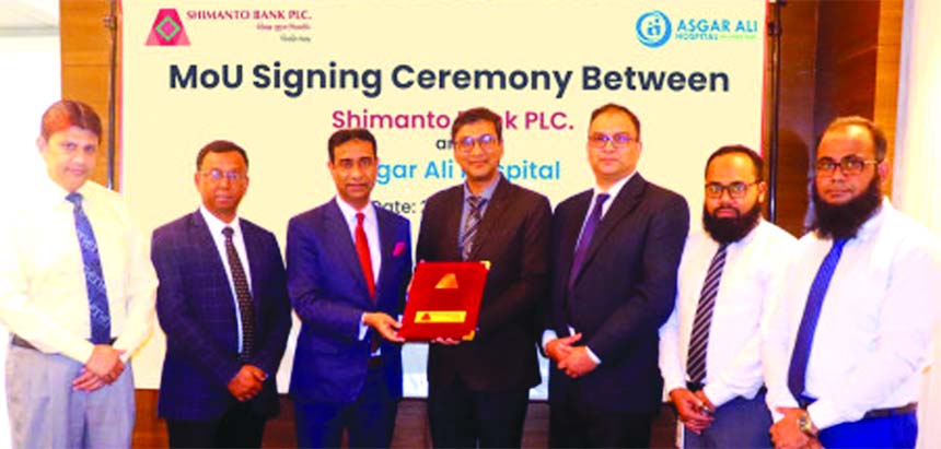Sahidul Islam, Head of Business of Shimanto Bank exchanges a deal document with Maruf Bin Hafiz, Senior Manager - Corporate Affairs of Asgar Ali Hospital on behalf of their respective organisations at a ceremony held at the bank's head office in the capital recently. Senior officials from both institutions were present.