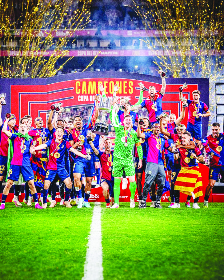 Barcelona players celebrate with the trophy after winning the Spanish Copa del Rey final football match at Estadio de La Cartuja stadium in Seville, Spain on Saturday.