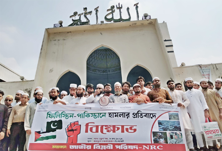 National Revolutionary Council holds a programme in front of Baitul Mukarram Mosque in the capital on Friday in protest against the attack on Gaza and Pakistan.
