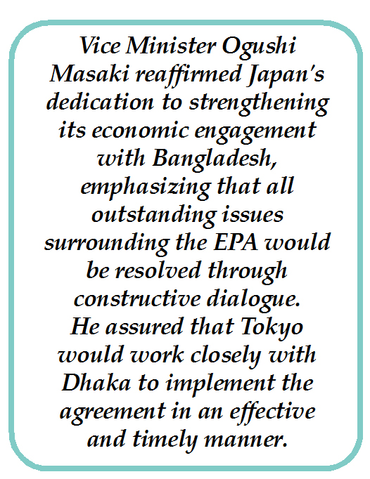 Vice Minister Ogushi Masaki reaffirmed Japan’s dedication to strengthening its economic engagement with Bangladesh, emphasizing that all outstanding issues surrounding the EPA would be resolved through constructive dialogue. He assured that Tokyo would work closely with Dhaka to implement the agreement in an effective and timely manner.