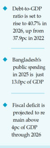 Bangladesh continues to lag behind its least developed country (LDC) graduating peers in both public spending and revenue mobilisation, with its fiscal deficit projected to remain above 4 percent of GDP through 2026.