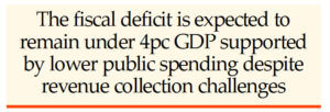 The fiscal deficit is expected to remain under 4per cent of GDP, supported by lower public spending despite revenue collection challenges.