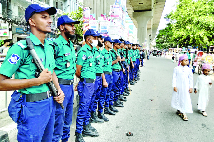 Members of police are on alert in front of Baitul Mokarram Mosque on Friday to avert any kind of untoward situation. June 14, 2025 Members of police are on alert in front of Baitul Mokarram Mosque on Friday to avert any kind of untoward situation.