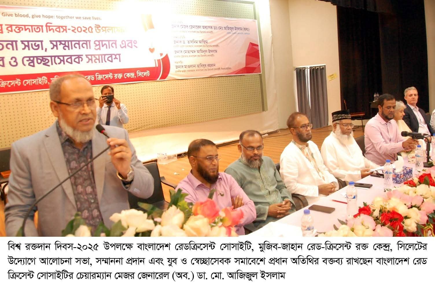 World Blood Donor Day-2025, observed in Sylhet. on the occasion of the day voluntary blood donation, discussion meeting, felicitation and youth and volunteer gathering were organized by the Bangladesh Red Crescent Society, Mujib-Jahan Red Crescent Blood Center, Sylhet.