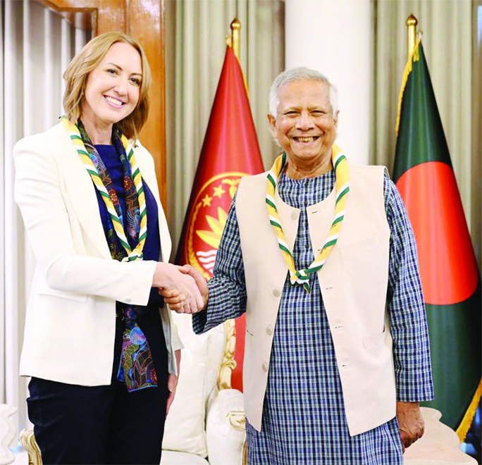 Chief Adviser Professor Muhammad Yunus shakes hand with Australian High Commissioner to Bangladesh Susan Ryle as she paid a courtesy call on him at the state guest house Jamuna in the capital on Tuesday.