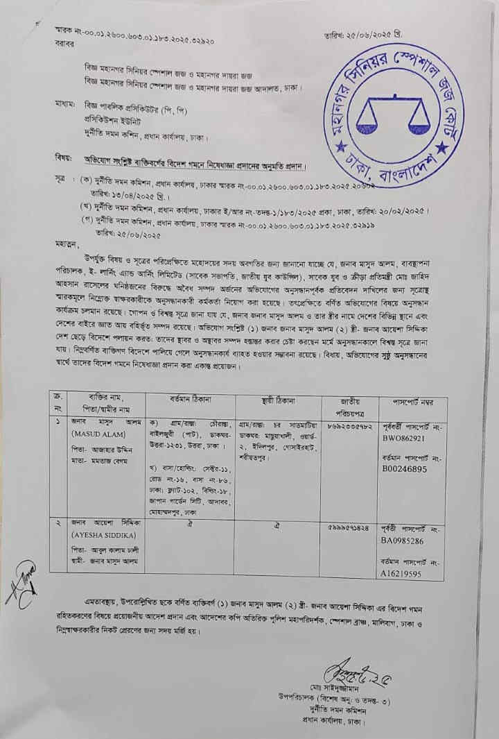 In an application seeking the travel ban, ACC Deputy Director Md. Saiduzzaman stated that Masud Alam is a close associate of former State Minister for Youth and Sports Mohammad Zahid Ahsan Russell. Taking advantage of this connection, Masud and his wife have allegedly amassed a large amount of illegal wealth through various irregularities and corrupt practices. The ACC is currently investigating the allegations against them.