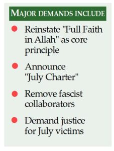 Among the key demands were: reinstating “Absolute Faith in Allah” as a constitutional principle, implementing PR-based elections in both parliamentary houses, launching a “July Charter” aligned with the 2024 uprising’s goals, and undertaking extensive reforms to dismantle authoritarian structures and promote transparency.