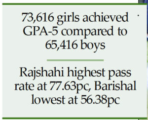 Among the general boards, Rajshahi posted the highest pass rate at 77.63 percent, followed by Jashore at 73.69 percent and Chattogram at 72.07 percent.