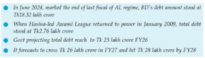 In June 2024, which marked the end of the last fiscal year of the AL regime, Bangladesh’s debt amount stood at over Tk18.32 lakh crore, as per the January Debt Bulletin published by the Finance Division.