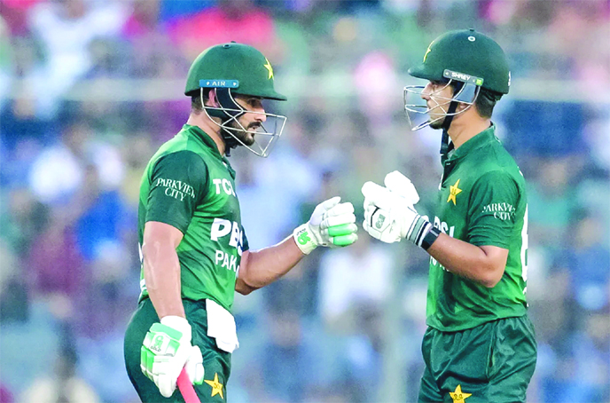 Sahibzada Farhan (left) of Pakistan toasts with Saim Ayub after hitting a four against Bangladesh during their third T20I match at the Sher-e-Bangla National Cricket Stadium in the capital's Mirpur on Thursday.