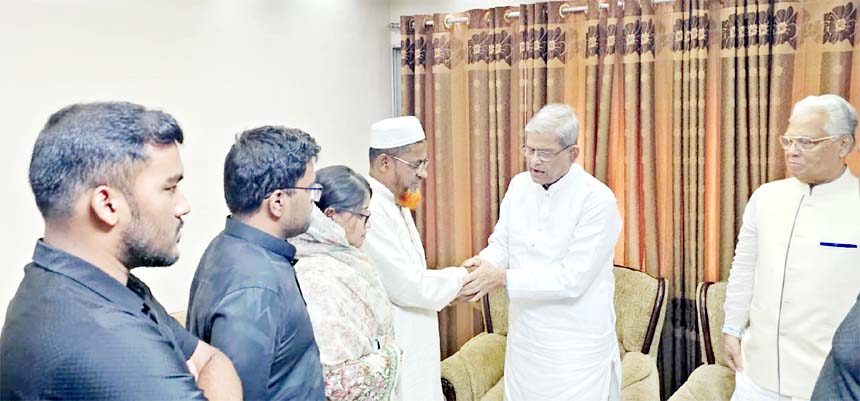 BNP Secretary General Mirza Fakhrul Islam Alamgir meets the family members of Flight Lieutenant Tawkir who was killed in the recent air crash at Dhaka Cantonment on Friday to convey sympathy to the bereaved family.