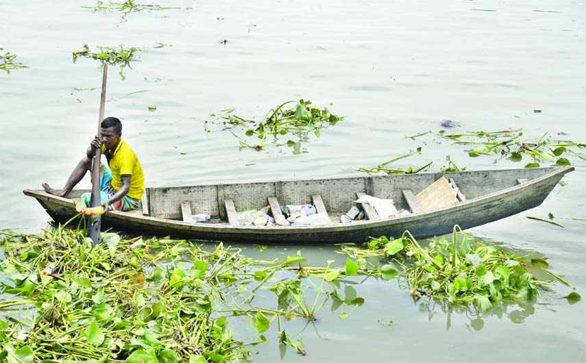 A boat man collects floating plastic bottles from the River Buriganga and sells those to scrap metal shops to earn livelihoods and thus helps minimise pollution in the river.