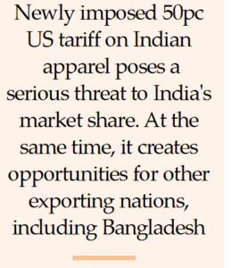 told The New Nation on Thursday, “The newly imposed 50pc US tariff on Indian apparel poses a serious threat to India’s market share. At the same time, it opens new doors for other exporting nations, including Bangladesh, Pakistan, Vietnam, Cambodia, and Indonesia.”