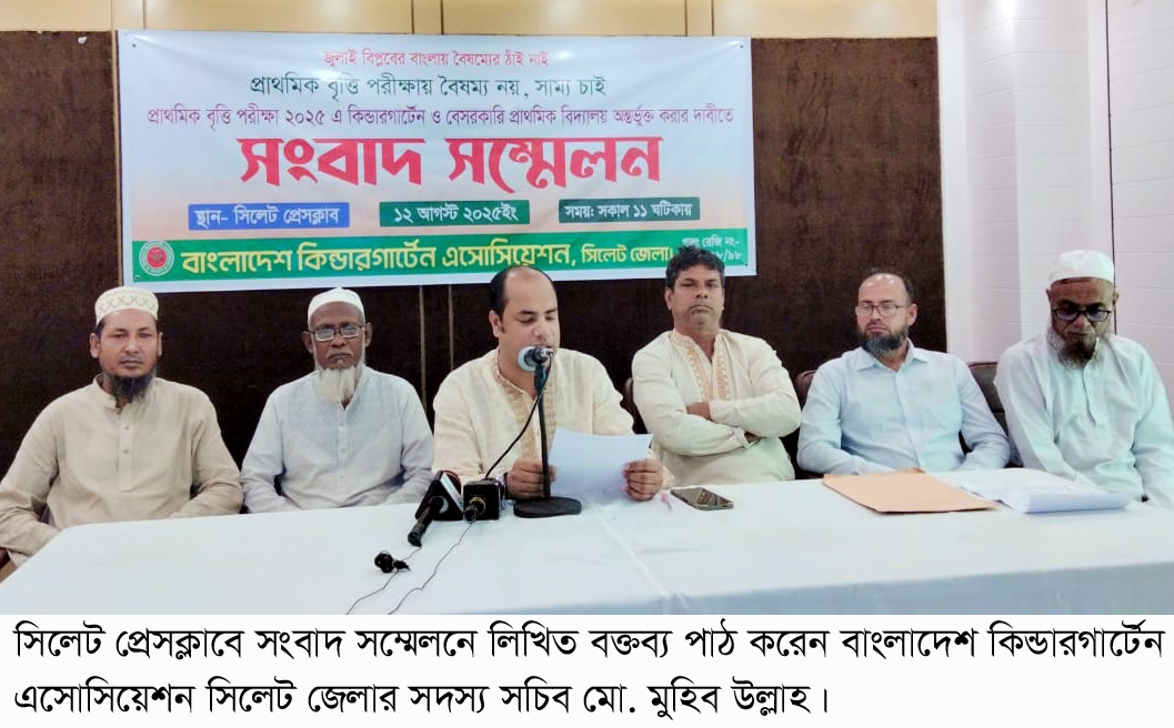 The leaders of the Bangladesh Kindergarten Association Sylhet district have demanded that kindergarten and private primary school students be given the opportunity to participate in the 2025 government primary scholarship exam. They made this demand at a press conference at the Sylhet Press Club on Tuesday.