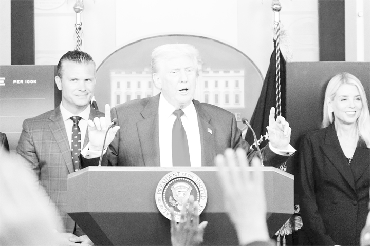 President Donald Trump speaks with reporters in the James Brady Press Briefing Room at the White House on Monday in Washington, as Secretary of Defense Pete Hegseth and Attorney General Pam Bondi look on.
