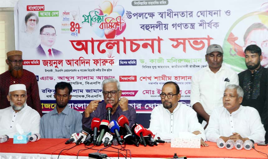 Adviser of BNP Chairperson Zainul Abdin Faruk speaks at a discussion meeting titled 'Proclaimer of Independence and Multi Party Democracy' organised by Zia Parishad at National Press Club on Friday.