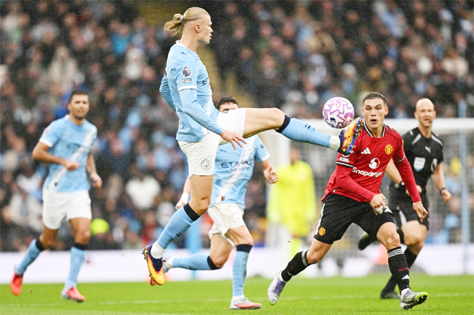 Manchester City's striker Erling Haaland (left) controls the ball during the Premier League football match against Manchester United at the Etihad Stadium in Manchester, north west England on Sunday.
