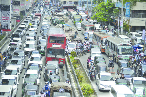 Hundreds of vehicles get stuck in the busy Dhaka streets due to not following traffic rules and political activities triggering immense sufferings to the commuters..The photo was taken from the city’s Karwan Bazar area on Thursday.