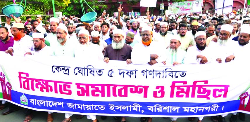 BARISHAL: Bangladesh Jamaat-e-Islami Barishal metropolitan brings out a protest rally and procession on the 5-point demands announced by the centre at Fazlul Haque Avenue in the city on Friday.