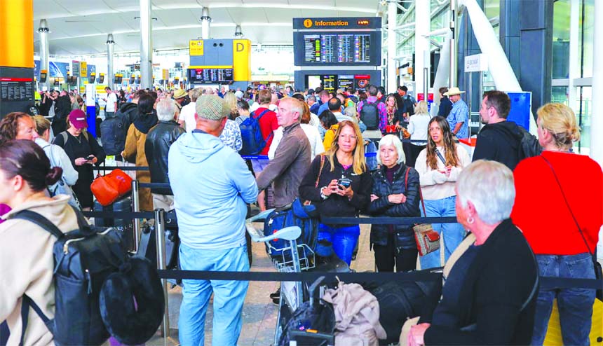 Travellers wait near a check-in area at Heathrow Airport Terminal 2, amid flights delay and cancellations, resulting from a disruption to check-in and boarding systems caused by a cyberattack which has affected several major European airports, in Greater London, Britain on Saturday.