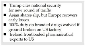 Trump had long threatened higher tariffs on drugmakers and Ireland, where mainly American-owned pharmaceutical factories employ about 2pc of the workforce, has frontloaded much of its exports to the U.S. in anticipation.