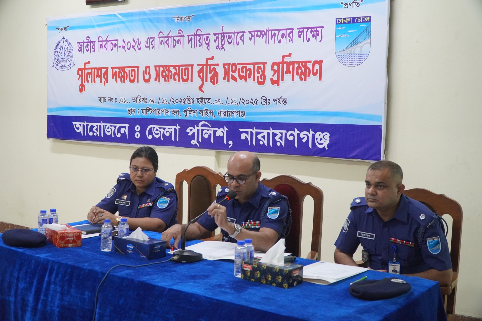 To ensure smooth and effective execution of duties during the upcoming National Parliamentary Election 2026, a special police training program has been launched in Narayanganj to enhance the efficiency and capability of police personnel. On Sunday (October 5), Superintendent of Police (SP) Mohammad Jasim Uddin, PPM (Bar), formally inaugurated the first batch of the training program at the Multipurpose Hall of the District Police Lines. A total of 50 trainees are participating in this initial session.